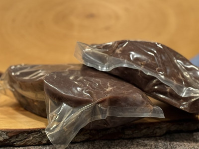 Hier sehen Sie vorbereiteten Sauerbraten im Vakuumbeutel. Das Fleisch liegt bereits in einer kräftigen Beize. Die typische dunkle Farbe entsteht durch die Marinade. Sie erhalten ein Stück, das sich gut schmoren lässt. Der Beutel hält die Würzung gleichmäßig. Ideal für einen klassischen Schmorbraten.